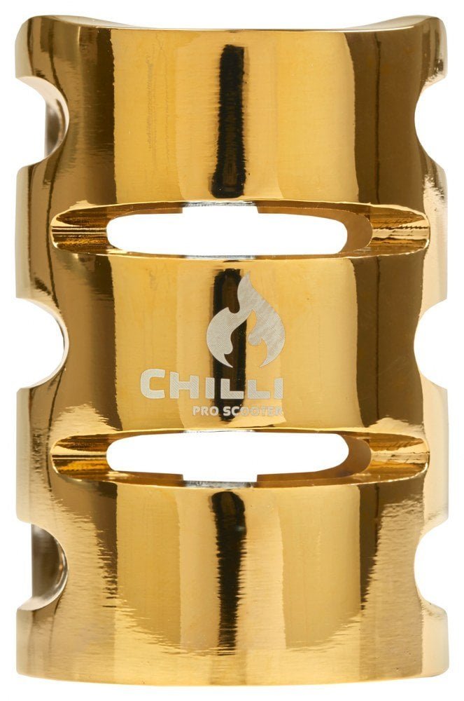 Die Chilli clamp HIC in goud is een 3-bout stuurklem voor HIC-compressie op freestyle steps. Deze Chilli clamp HIC is bedoeld voor unisex rijders die een stabiele, spelingsvrije klemming willen zonder overbodige onderdelen.Het grote voordeel: drie bouten verdelen de klemkracht evenwichtig over het stuur. Op de foto zie je een goud geanodiseerde body met een strakke frontplaat en drie zwarte inbusbouten in lijn.Achterop valt de kroonvormige uitsparing op; die zorgt voor gewichtsbesparing en een herkenbare look. De binnenkant oogt glad en braamvrij, met een nette sleuf voor gelijkmatige compressie. De combinatie van hoogwaardig aluminium, 3-bout klemkracht en HIC-compatibiliteit geeft directe stuurcontrole en betrouwbare fixatie in park en street.
