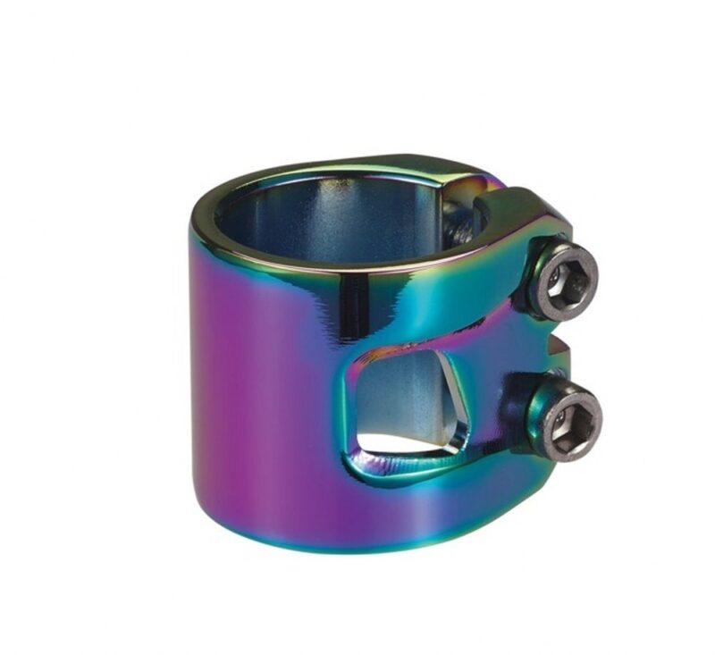 Die Chilli klem in Neochroom is een compacte, dubbelbouts stuurklem voor freestyle steps. Deze Chilli klem is bedoeld voor unisex rijders die betrouwbare klemkracht en eenvoudige montage willen.Het grote voordeel: gelijkmatige druk met twee stalen inbusbouten, zodat je bar strak blijft zitten. Op de foto zie je een iriserende neochroom klem met twee zwarte boutkoppen en een helder wit Chilli-logo aan de voorzijde.De behuizing is massief aluminium met afgeronde randen en nette afschuiningen. De regenboogfinish wisselt van groen en paars naar goud, afhankelijk van het licht. De combinatie van solide body, strakke passing en lage bouwhoogte geeft stabiele klemming zonder dat de klem in de weg zit.