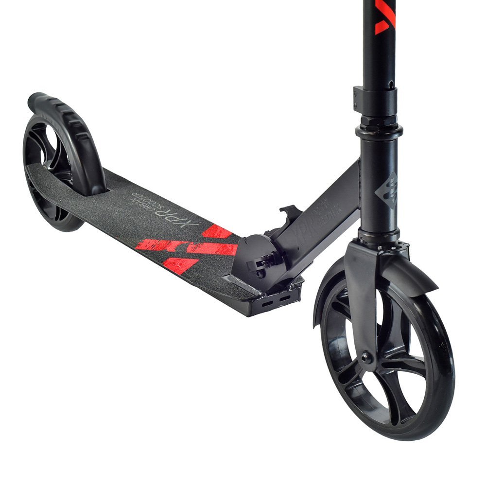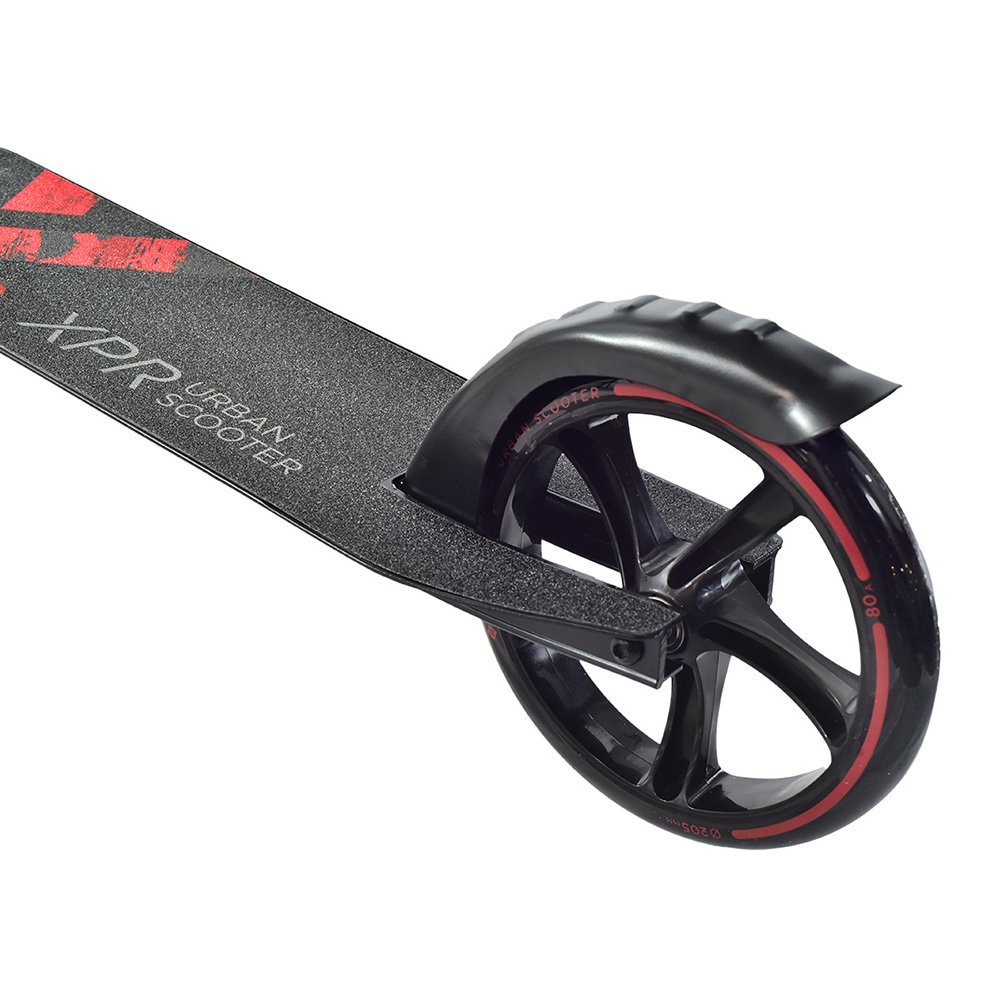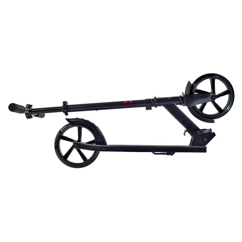 Die Street Surfing XPR 205 in zwart/rood is een vouwbare urban step met grote 205 mm wielen. Deze Street Surfing XPR 205 is bedoeld voor unisex rijders die snel, comfortabel en onderhoudsarm door de stad willen bewegen.Het grote voordeel: de combinatie van 205 mm wielen en een laag deck rolt licht en blijft stabiel, ook op ruw asfalt. Op de foto zie je een matzwarte step met rode accenten, een brede T-bar, en duidelijk zichtbare XPR 205-graphics op het deck.Je ziet een stevig vouwscharnier met vergrendeling aan de voorzijde, antislip griptape over het hele deck en een achterspatbord-rem. De combinatie van het vouwmechanisme, de hoogteverstelling van het stuur en de zijstandaard geeft een praktische step die je makkelijk meeneemt en netjes parkeert.