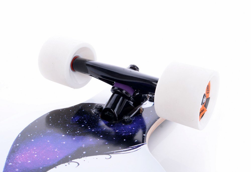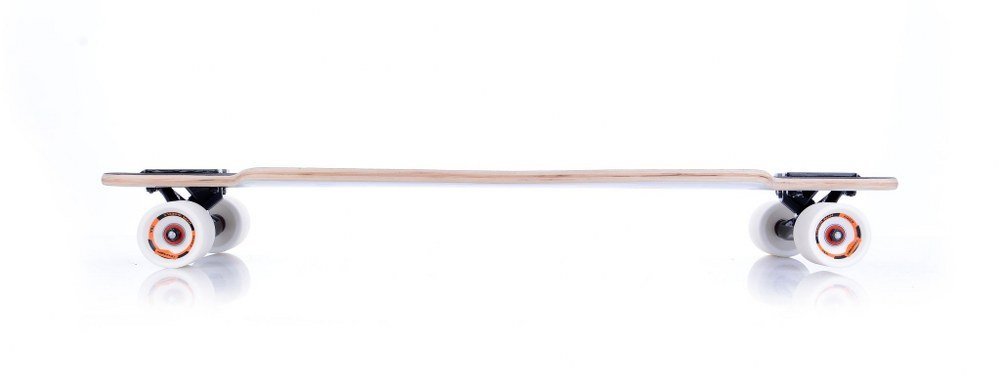 Het Tempish longboard in 0 is een compact 32,5-inch board voor dagelijks cruisen. Dit Tempish longboard is bedoeld voor unisex rijders die stabiel en soepel door de stad willen rollen zonder gedoe.Het grote voordeel: korte wielbasis voor wendbaarheid met voldoende stabiliteit bij tempo. Op de foto zie je een compact deck met strakke zwarte griptape, aluminium trucks en grote, zachte wielen die oneffenheden dempen.Onderop staat een duidelijke vos-illustratie over de houten decklagen. De zichtbare lagen hout en de solide truckmontage zorgen voor een stevige basis. De combinatie van compacte lengte, volle griptape en zachte wielen geeft controle, comfort en vertrouwen op straat.