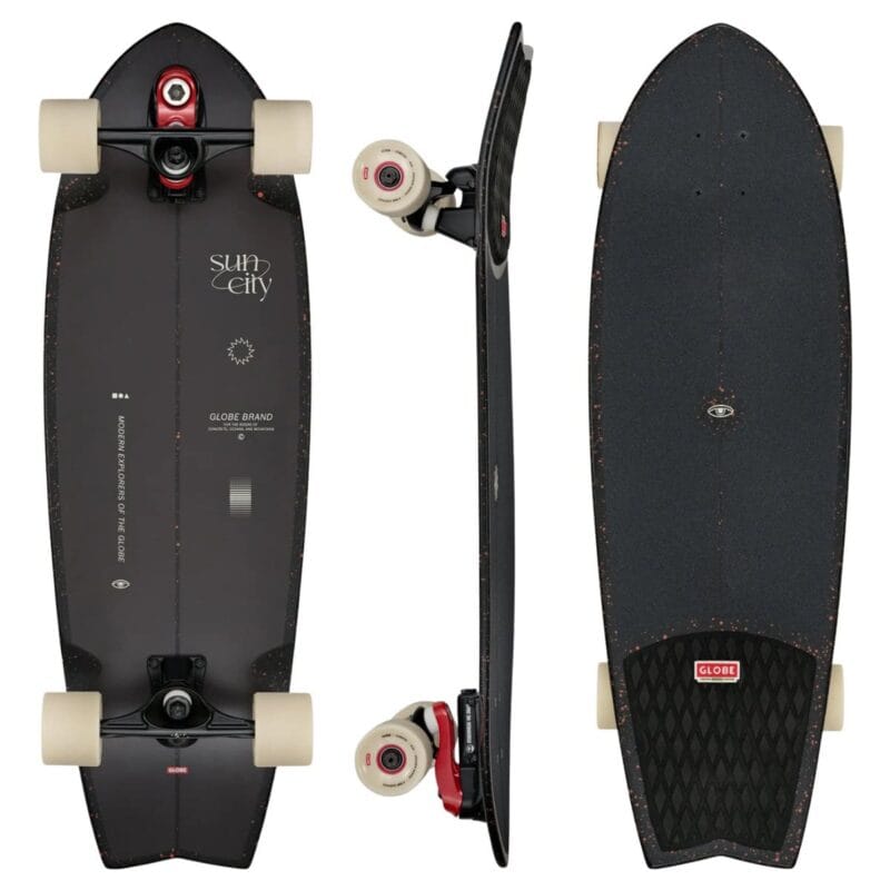 Surf-gevoel op straat: de Globe Sun City 2 Surf Skate (30″) met swallow-tail shape, Slant Surf/Skate trucks, 65mm 83A wielen en een BLOOM™ algae-foam tailpad voor grip bij carves en pumps.