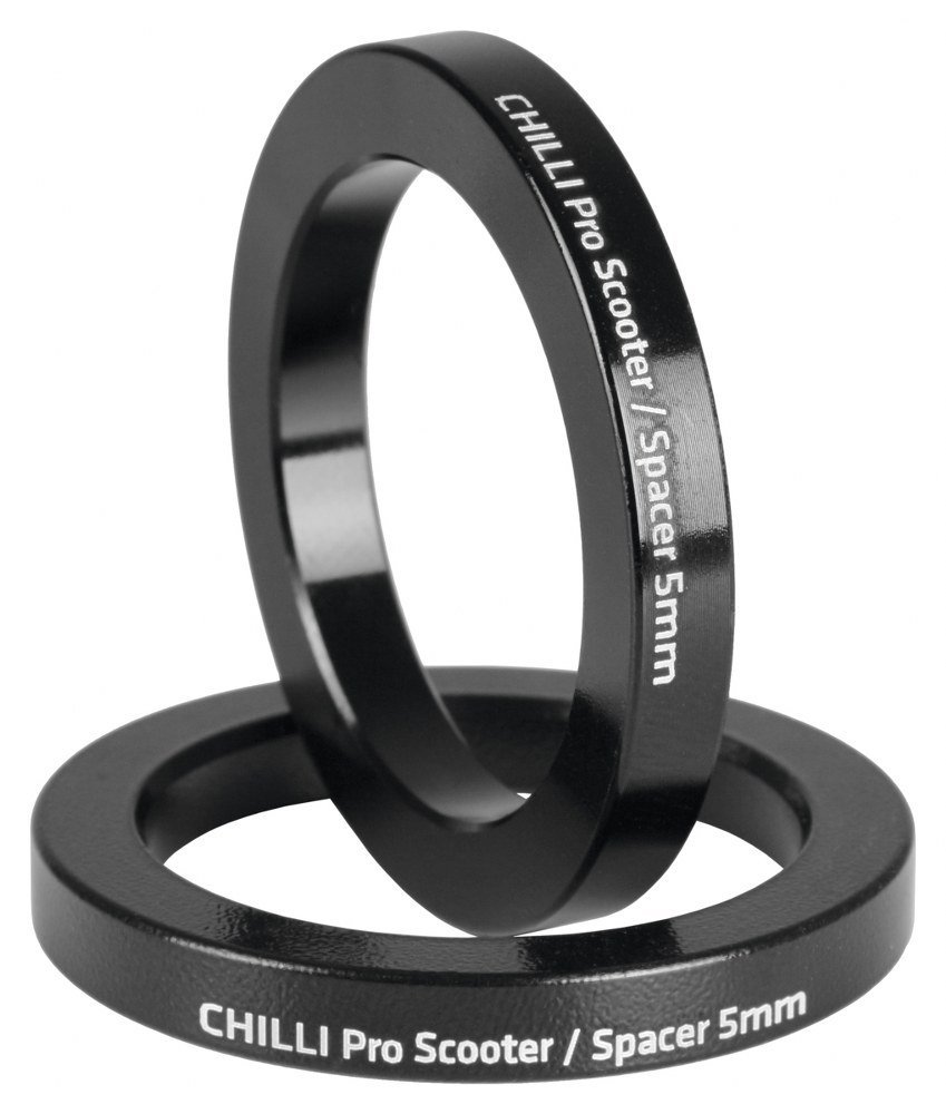 De Chilli spacer 5mm in zwart is een compacte headset afstandsring voor je stuntstep. Deze Chilli spacer 5mm is bedoeld voor rijders die hun balhoofd strak en spelingvrij willen afstellen.Het grote voordeel: precies 5 mm hoogte om je stack te finetunen zonder onnodige opbouw. Op de foto zie je een zwarte, metalen ring met een duidelijk wit CHILLI-logo en een nette, egale finish.De randen zijn licht afgerond en de binnen- en buitenzijde zijn strak gefreesd. De combinatie van 5 mm hoogte, een gladde afwerking en een stevig metalen lichaam geeft een stabiele, nette passing tussen headset en clamp.