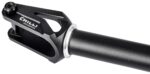 De chilli stepvork in zwart is een sterke, lichtgewicht HIC-vork voor freestyle en street steppen. Deze chilli stepvork is bedoeld voor unisex rijders die een strakke en betrouwbare voorkant willen met weinig onderhoud. Het grote voordeel: nauwkeurige passing voor 120×27 mm wielen en een 160 mm stuurbuis die netjes in geïntegreerde headsets valt. Op de foto zie je een volledig zwarte, één-delige vork met opengewerkte “spider” uitsparingen en een slank, recht bovenvlak. De web-uitsparingen aan voor- en zijkant, de afgeronde schouders en de nette freeslijnen vallen op. De combinatie van CNC-gefreesd aluminium, slim-cut design en HIC-compatibiliteit geeft laag gewicht, hoge stijfheid en direct stuurgevoel.