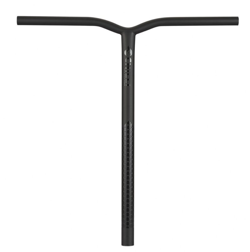 De Chilli T-Bar Rocky in zwart is een stalen T-stuur voor urban en freestyle steppen. Deze Chilli T-Bar Rocky is bedoeld voor unisex rijders die controle, duurzaamheid en een strak stuurgevoel zoeken.Het grote voordeel: de honingraat uitsparingen in de crossbar verlagen het gewicht zonder in te leveren op stevigheid. Op de foto zie je een matzwarte T-bar met rechte lijnen, een brede dwarsbuis en het herkenbare witte Chilli-logo op de opgaande buis.Duidelijke visuele details: honingraatgaten over de lengte van de horizontale buis, nette las ter hoogte van de kruising en strakke, rechte uiteinden. De combinatie van stalen constructie, 58 cm hoogte en 56 cm breedte geeft direct stuurgedrag en stabiele landingen.